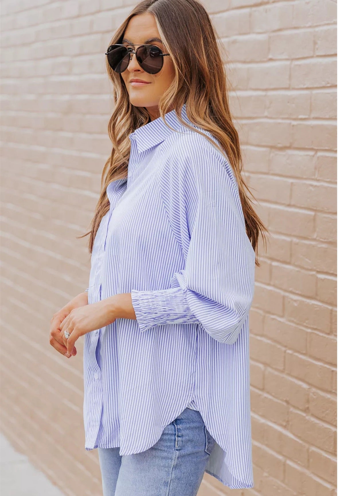 Blue smocked cuffed striped boyfriend shirt